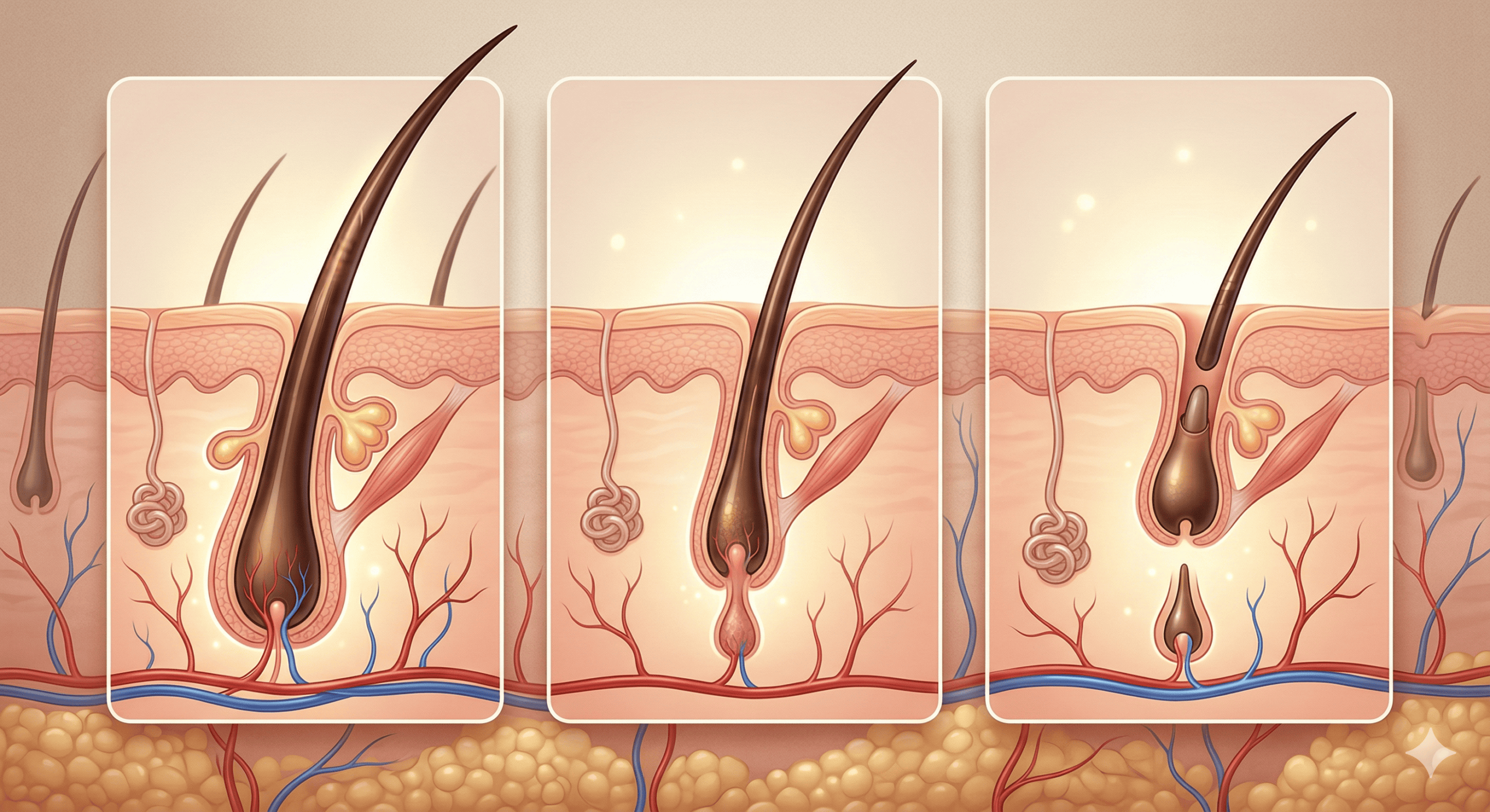 • Всеки косъм преминава през три основни фази: анаген (растеж), катаген (преход) и телоген (покой и косопад).