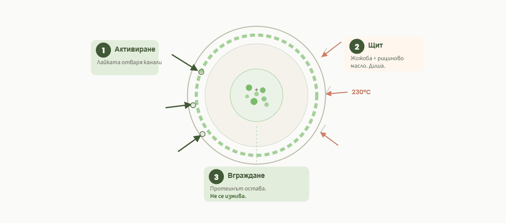 Стъпка 2 – Защита. Жожоба и рициново масло изграждат бариера, която издържа над 230°C. Без силикони. Без тежест. Буквално не усещаш нищо по косата след нанасяне – и това е точно целта.