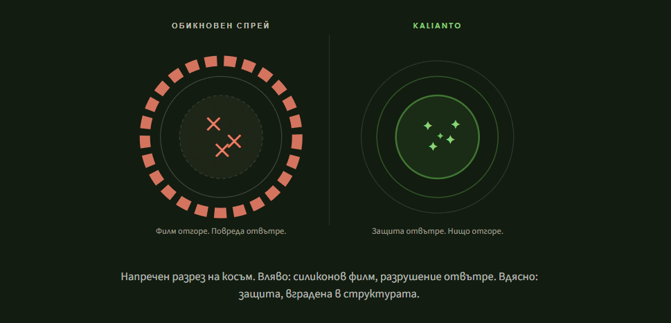 За Kalianto: разклащаш бутилката, нанасяш върху влажна коса от разстояние 15-20 см, 3-4 впръсквания. Не повече. Среши и изсуши. Целият процес – 10 секунди.